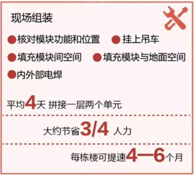 在模块化建筑的工地上,工地平整,几乎没有扬尘,也没有电钻电锤刺耳噪声,只有履带吊车发出的轻轻轰鸣。一看模块上的数字,工人就知道对应的功能和组装位置。据了解,模块化建筑结构与钢筋混凝土结构相比,现场施工节电70%、节水70%,减少建筑物垃圾85%,95%建筑废弃物可回收利用。